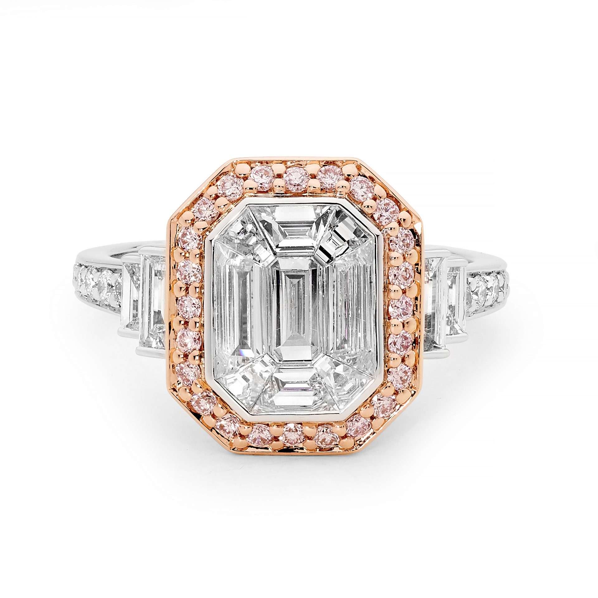 This stunning white and rose gold engagement ring looks spectacular from any angle with its modern geometric lines. Set in contrasting 18-carat white and rose gold, this glistening ring features one Magic Emerald Cut centre (9=1.00ct tdw G/VS-SI)ย surrounded by argyle pink (24x 0.01ct SI), baguette (2x 0.06ct G/SI and 2×0.095ct G/VS-SI) and round brilliant cut white diamonds (4×0.008ct, 2×0.01ct, 6x 0.016ct G/SI).