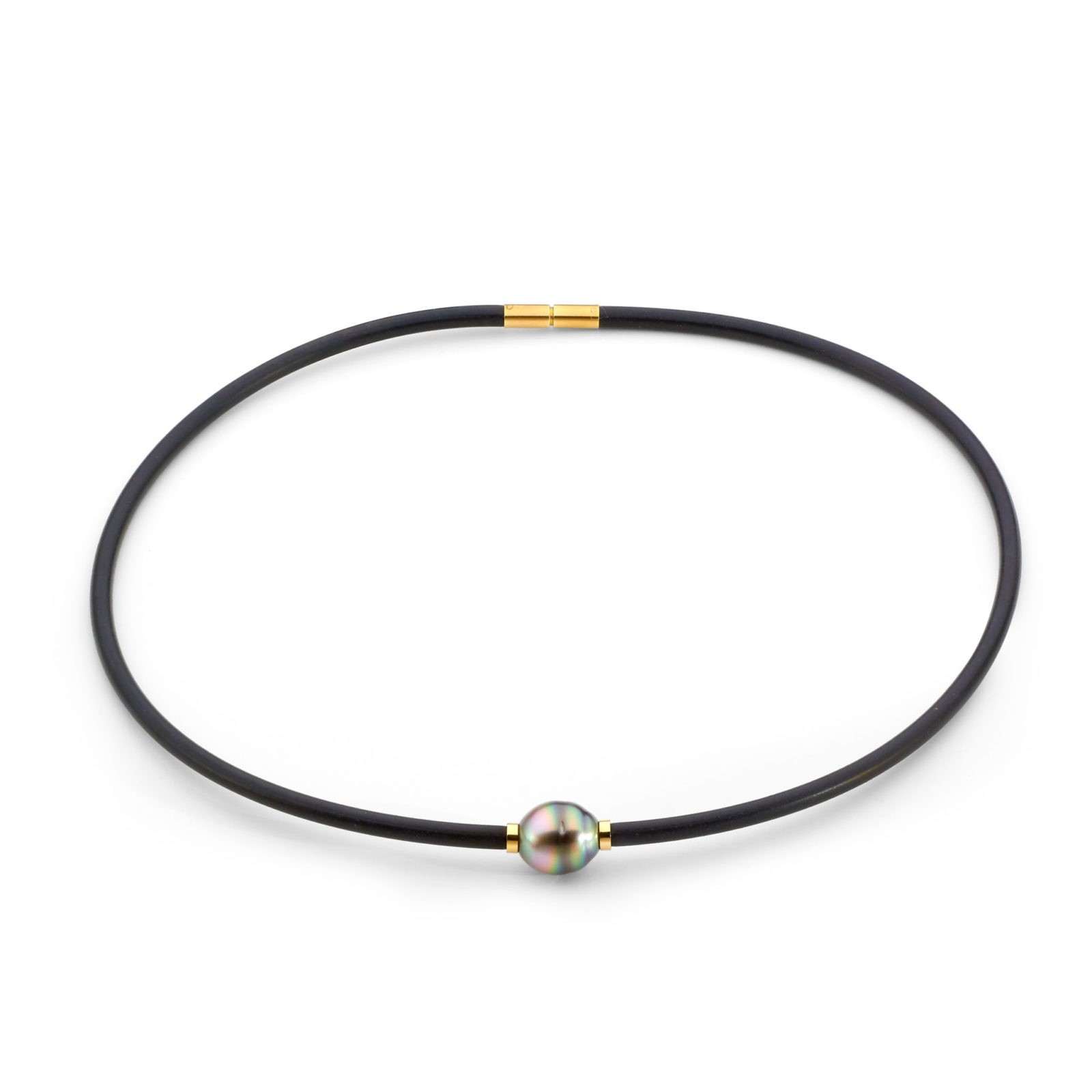 Set in 18ct yellow gold, this unisex Tahitian neoprene necklet features a lustrous 12mm -13mm Tahitian South Sea pearl and two 18ct yellow gold collars on either side.