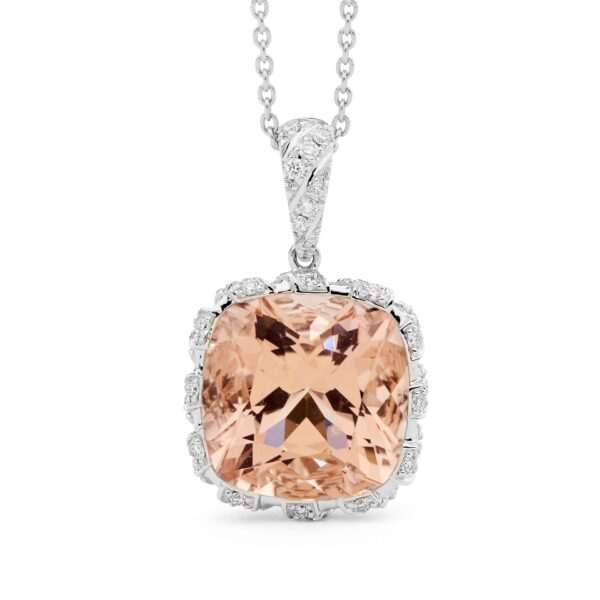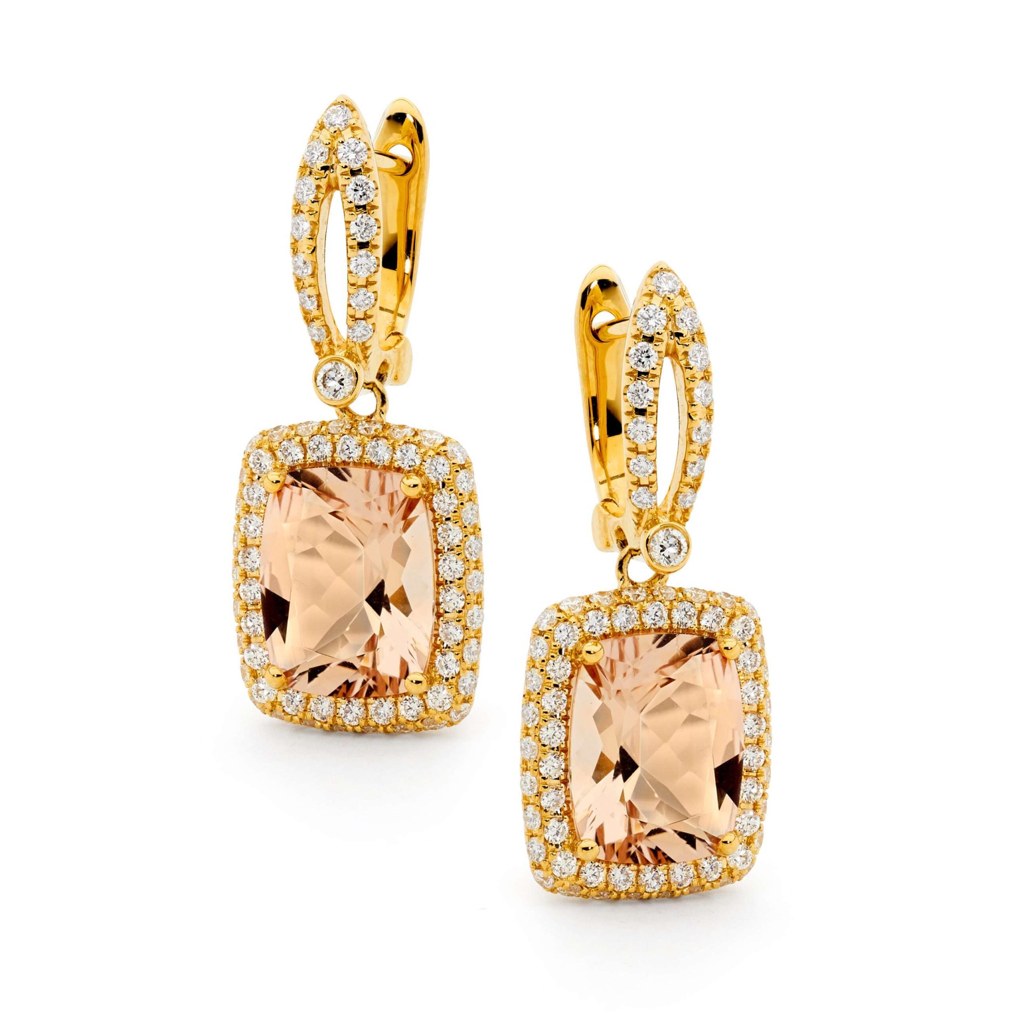 Crafted in 18ct yellow gold, these beautiful earrings feature Morganite (2=4.81cts), and include 140=0.95ct G/SI round brilliant cut diamonds.