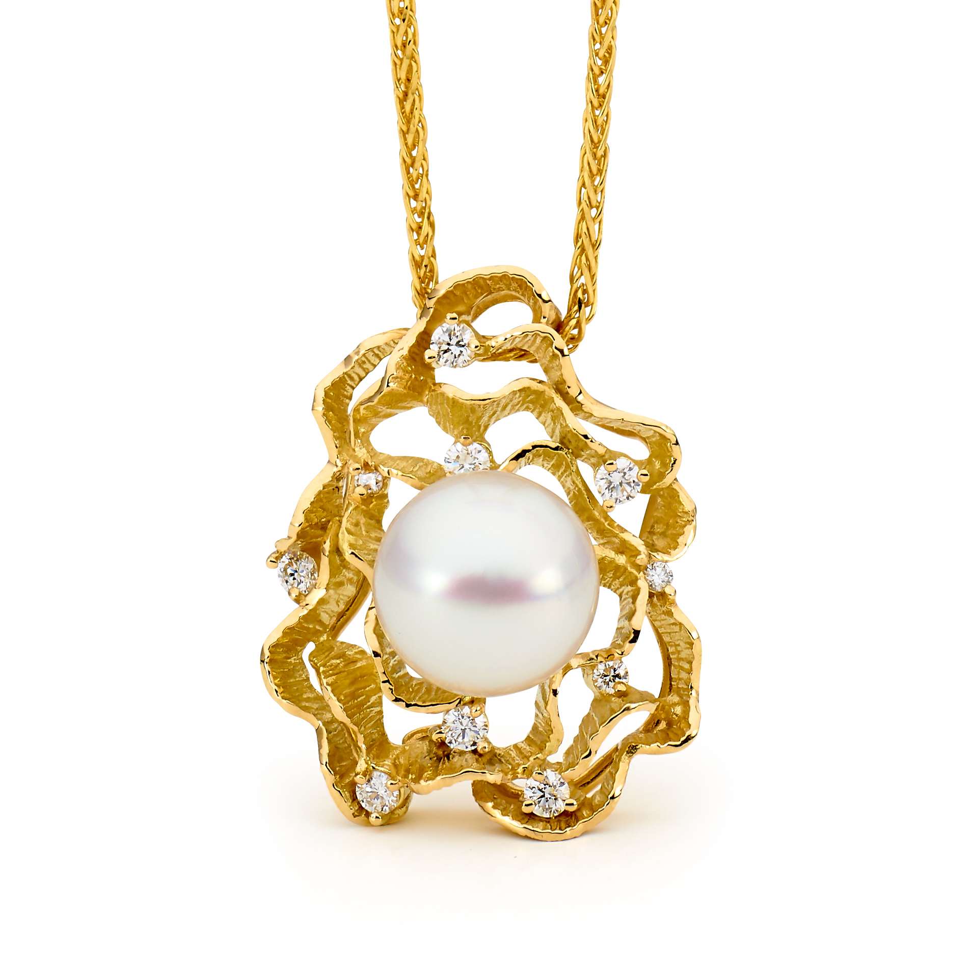 Set in 18ct yellow gold, the Ningaloo Coral Pendant features ten (10=0.41ct G/SI) glistening diamonds surrounded by a luminous 11.5mm Australian South Sea button pearl with excellent lustre.