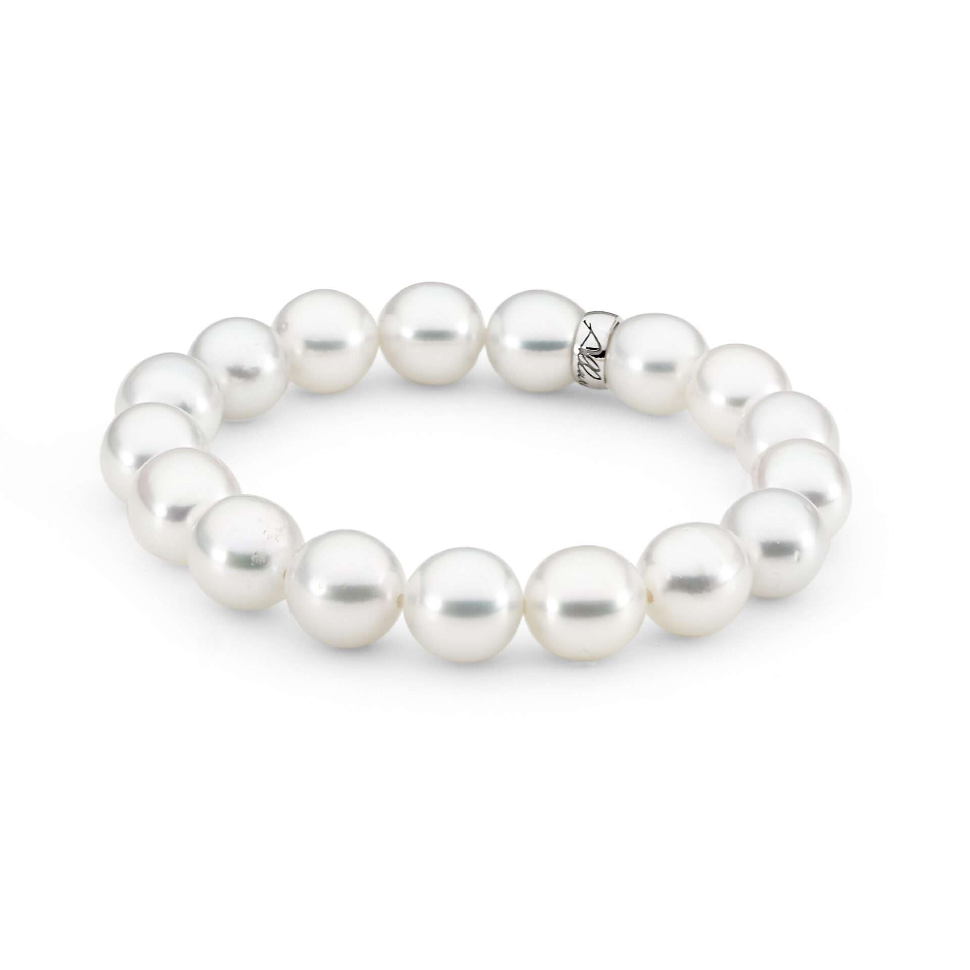 A 17-piece Australian South Sea pearl strand bracelet, featuring 10mm-11mm white oval culturedย pearls with excellent lustre. This bracelet has been carefully threaded with elasticised nylon, finished with an 18ct white gold Allure rondel. MADE