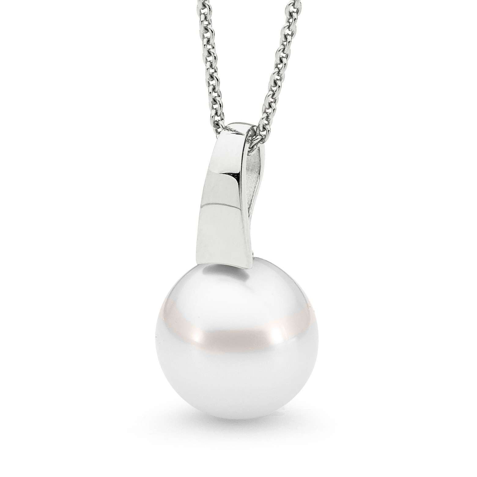 Set in 18ct white gold, this wide flat tapered bale pendant features one lustrous 13-14mm oval/drop white South Sea pearl with excellent lustre.
