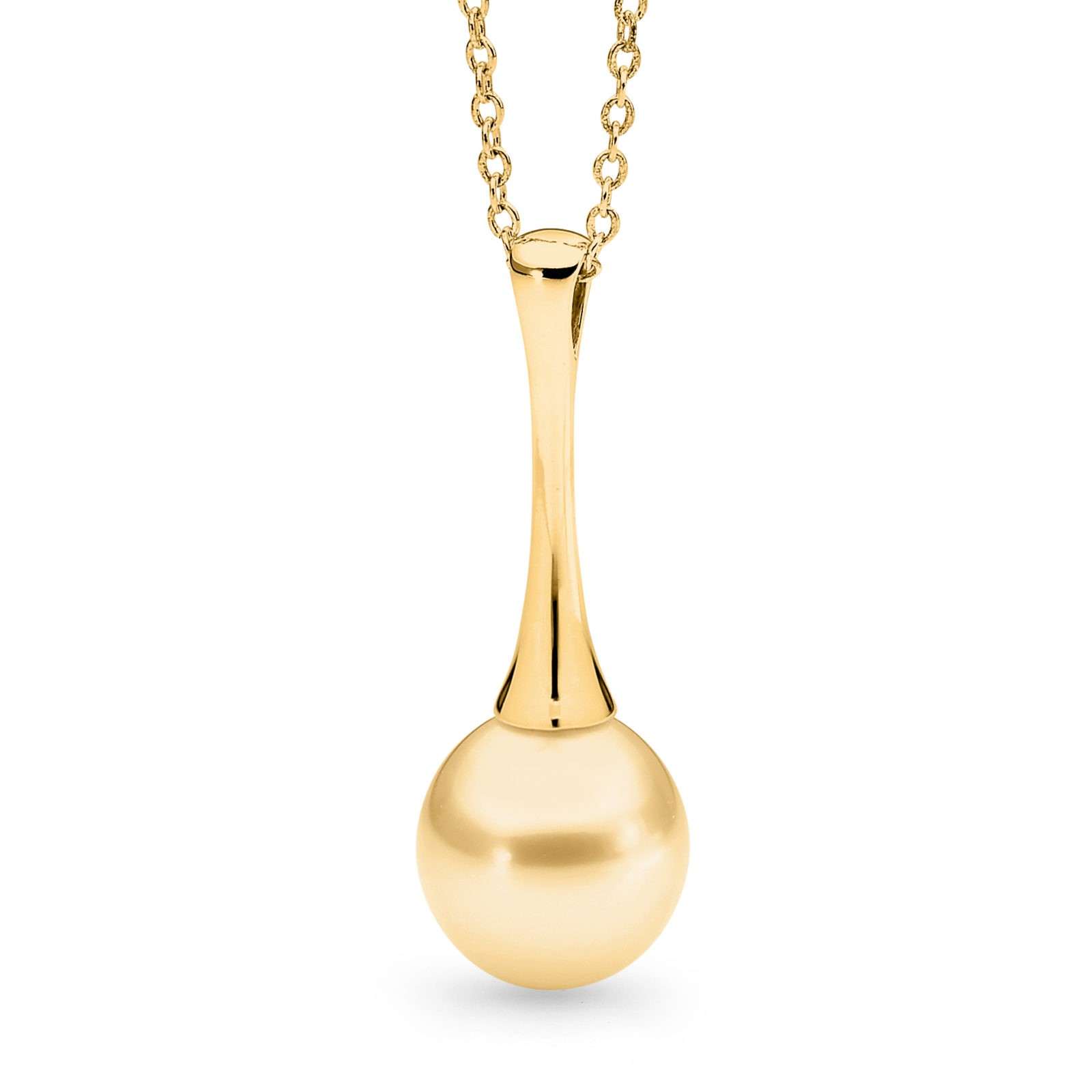 Set in 18ct gold, this elongated trumpet bale pendant features one 13-14mm oval/drop South Sea pearl with excellent lustre. Available in 18ct yellow or white gold, with three pearl colour variations. Please select your desired