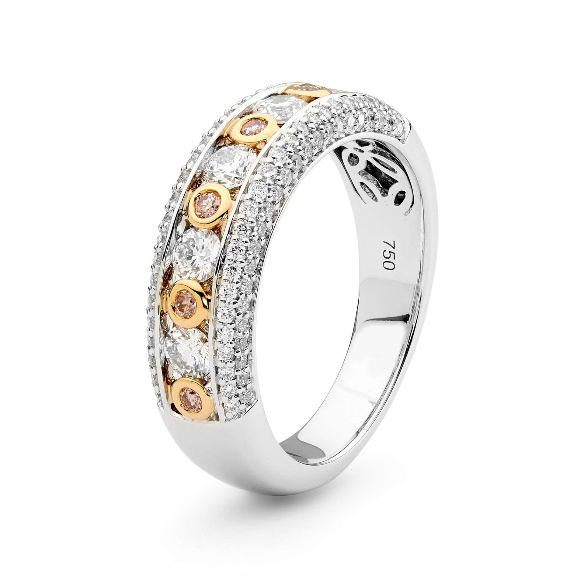 This 18ct white gold diamond dress ring features 6x 0.015ct 6PR/SI round brilliant cut pink rose Argyle diamonds set in 18ct rose gold bezel settings, along with 5x 0.106ct G/SI white diamonds. The perimeter of this ring includes 98x 0.0035ct G/SI all round brilliant cut.