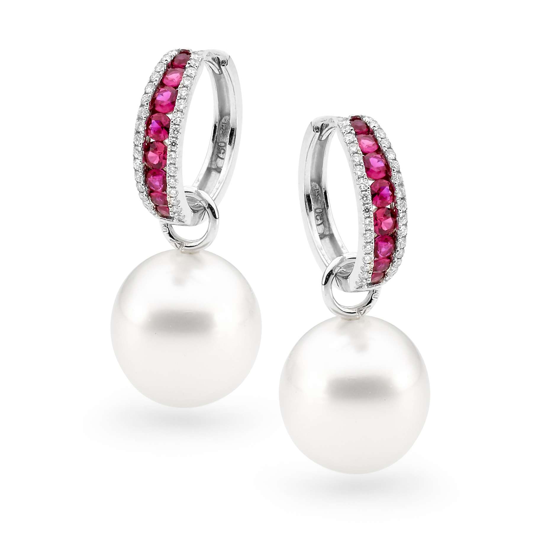 Crafted in 18ct white gold, these elegant earrings feature a lustrous pair of 12-13mm oval/drop Australian South Sea cultured pearls, and include 64=0.20ct G/SI white diamonds and 16=0.64ct pink sapphires.