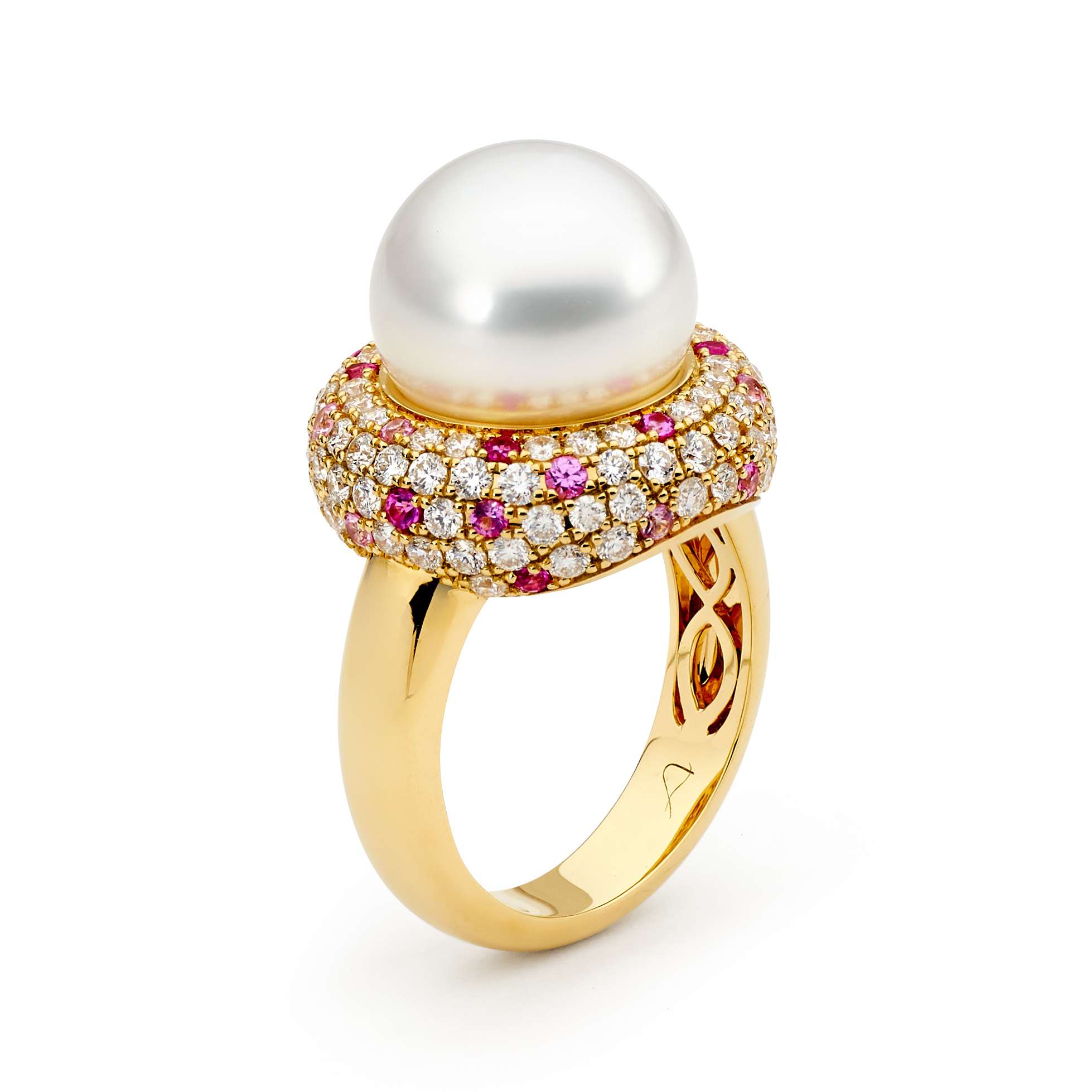 This beautiful ring has been crafted in 18ct yellow gold and features a lustrous 12.67mm Australian South Sea cultured button pearl, 90=1.36ct G/SI round brilliant cut diamonds, & 28=0.56ct Pink Sapphires.