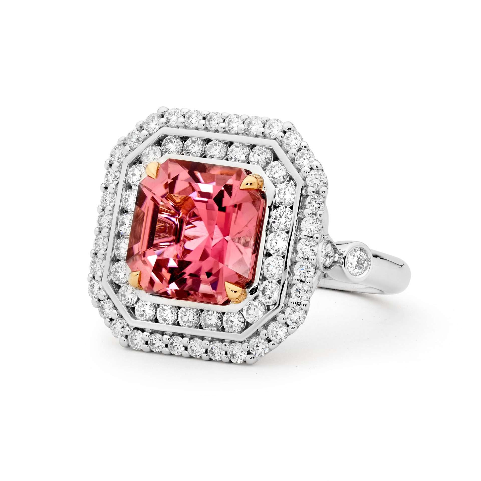 This exceptional 18ct white & rose gold double halo ring is set with 1=5.54ct asscher cut pink tourmaline (10.56 x 10.52 x 7.59mm) and is surrounded by 64=1.25ct G/SI round brilliant cut diamonds.
