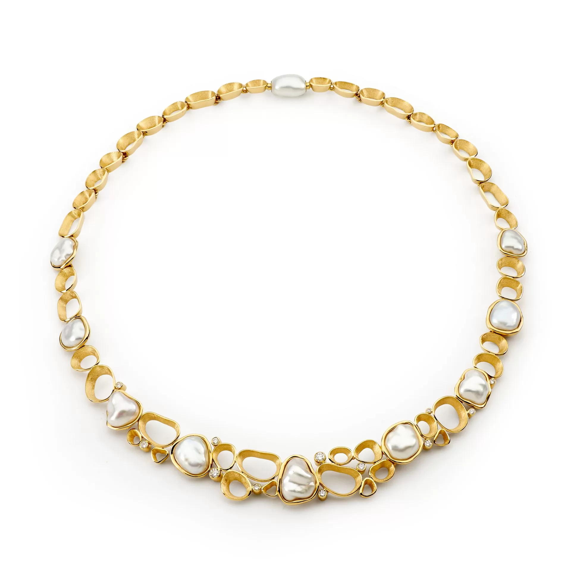 The beautiful Rockpools Collier is handcrafted in 18ct yellow gold and features nine 8.5-10.2mm Australian South Sea keshi pearls and 12=0.705ct G/SI white diamonds.