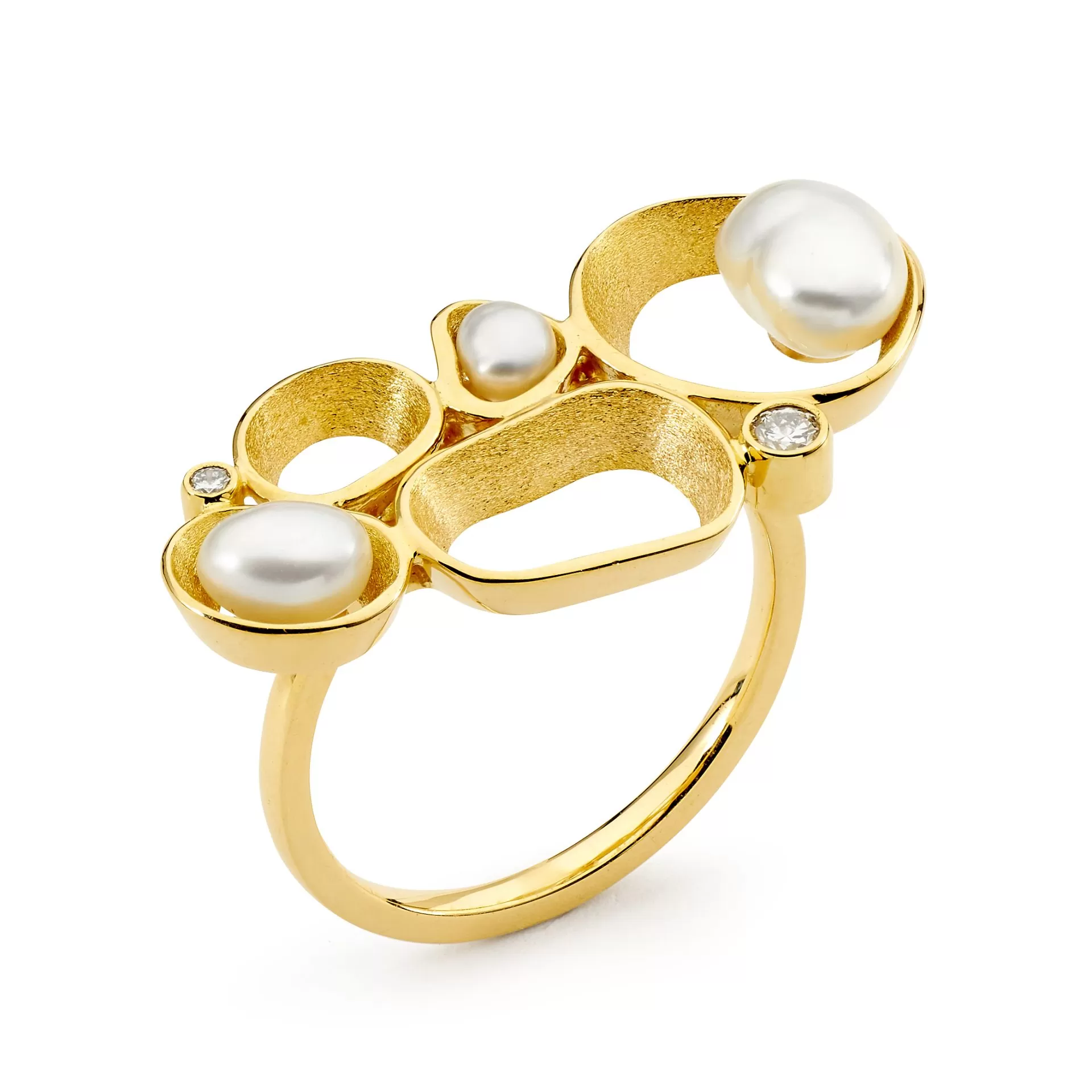 Handcrafted in 18ct yellow gold the Rockpools Keshi Ring features three 3.9-7.2mm Australian South Sea keshi pearls and 2=0.065ct G/SI round brilliant cut diamonds.