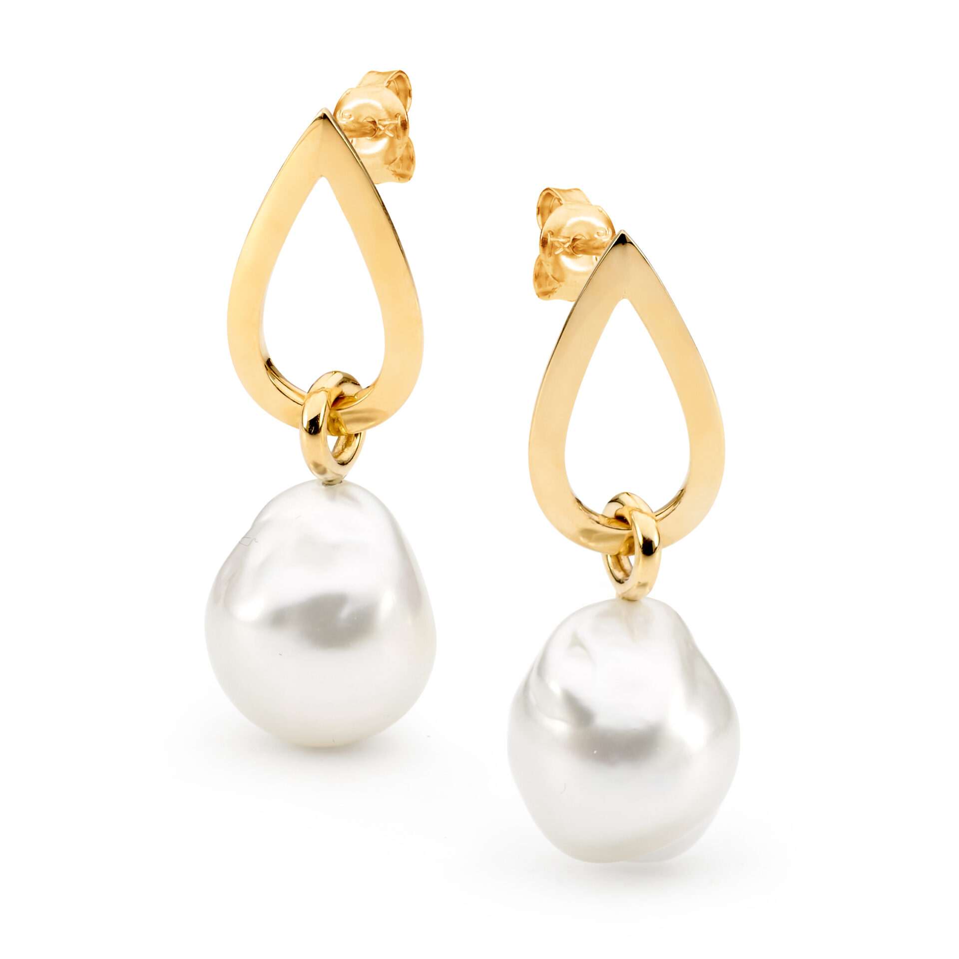The Sky earrings feature two (15-16mm) white baroque pearls set against 18 carat yellow gold to reflect the organic, fluid nature of the striking white peaks which inspire them.