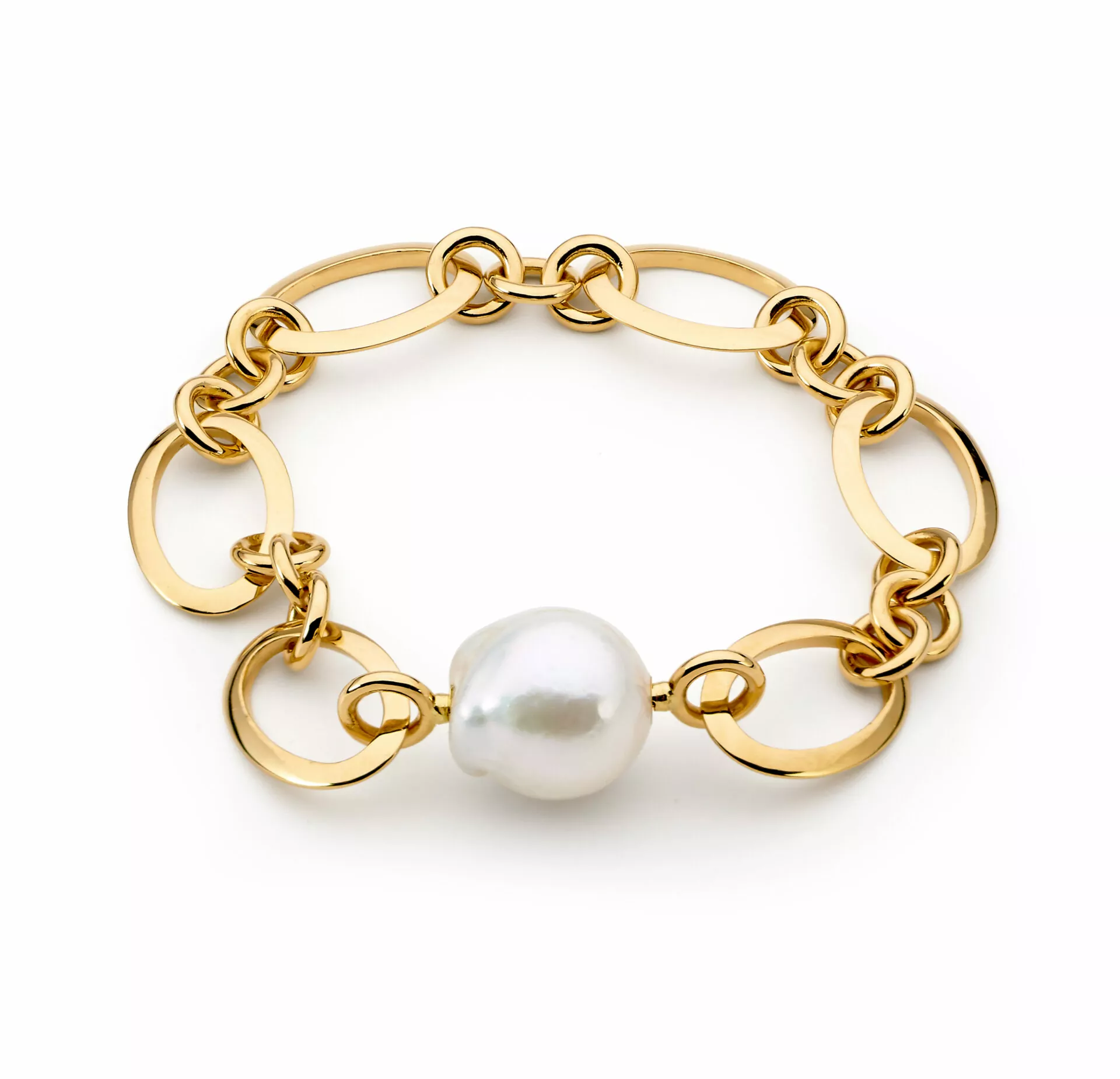 The Sky bracelet features one (15-16mm) delicately placed white oval baroque South Sea pearl, set against 18 carat yellow gold to reflect the organic, fluid nature of the striking white peaks which inspire them.