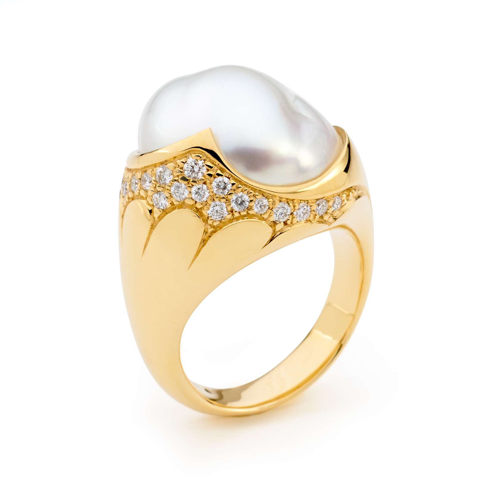 This Sky ring features oneย floating baroqueย (15.7-17mm) South Sea Keshi pearl and white (19= 0.36ct) diamonds set in 18 carat yellow gold to reflect the organic, fluid nature of the striking white peaks which inspire them.
