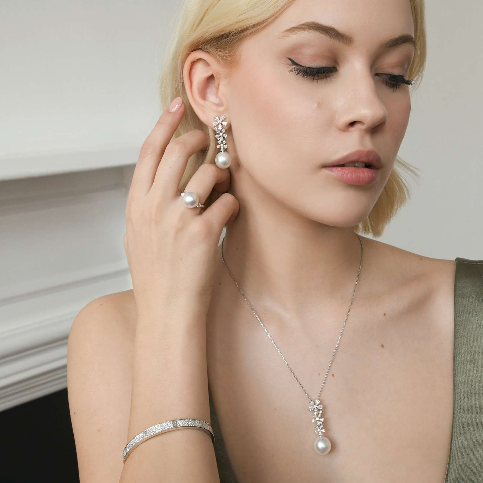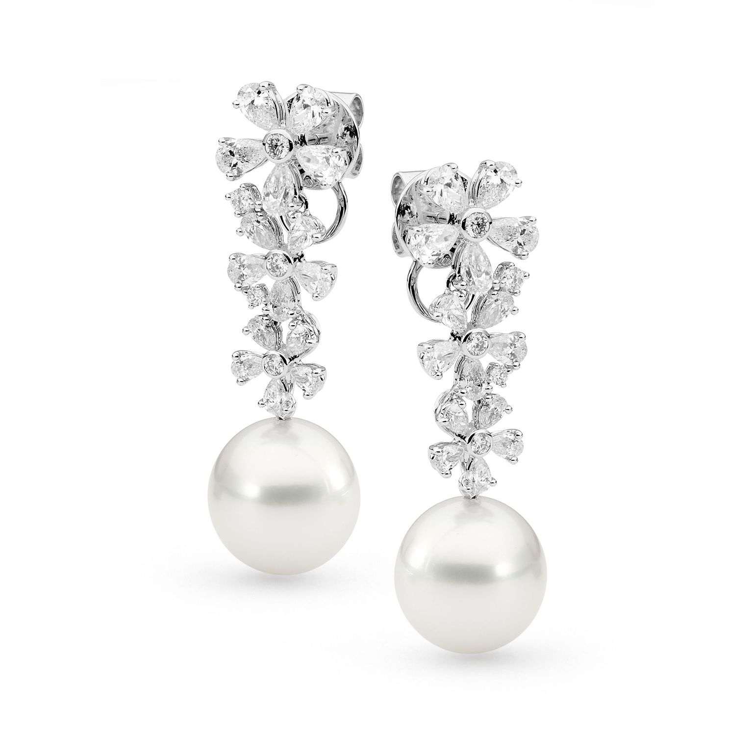 Set in 18ct white gold, these glamourous stud earrings feature 40= 3.04ct (30 pear cut/10 round brilliant cut G/SI+) white diamonds, and a pair of detachable 12-13mm white oval Australian South Sea pearls.