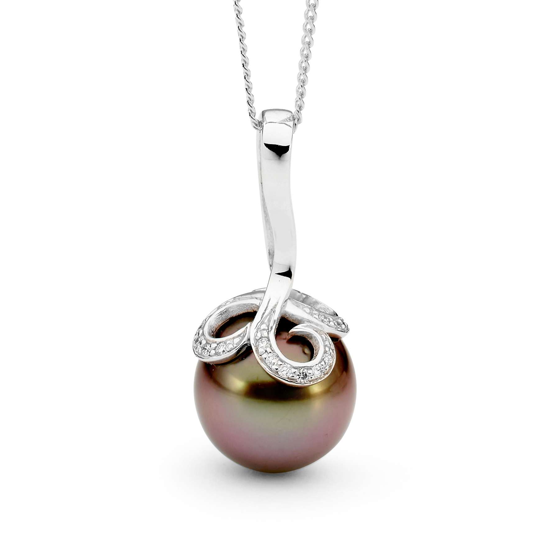 An exclusive Fleur de Lis design set in 18ct white gold with 16=0.16ct G/SI diamonds and an incredible 14-15mm oval/drop Tahitian South Sea pearl.