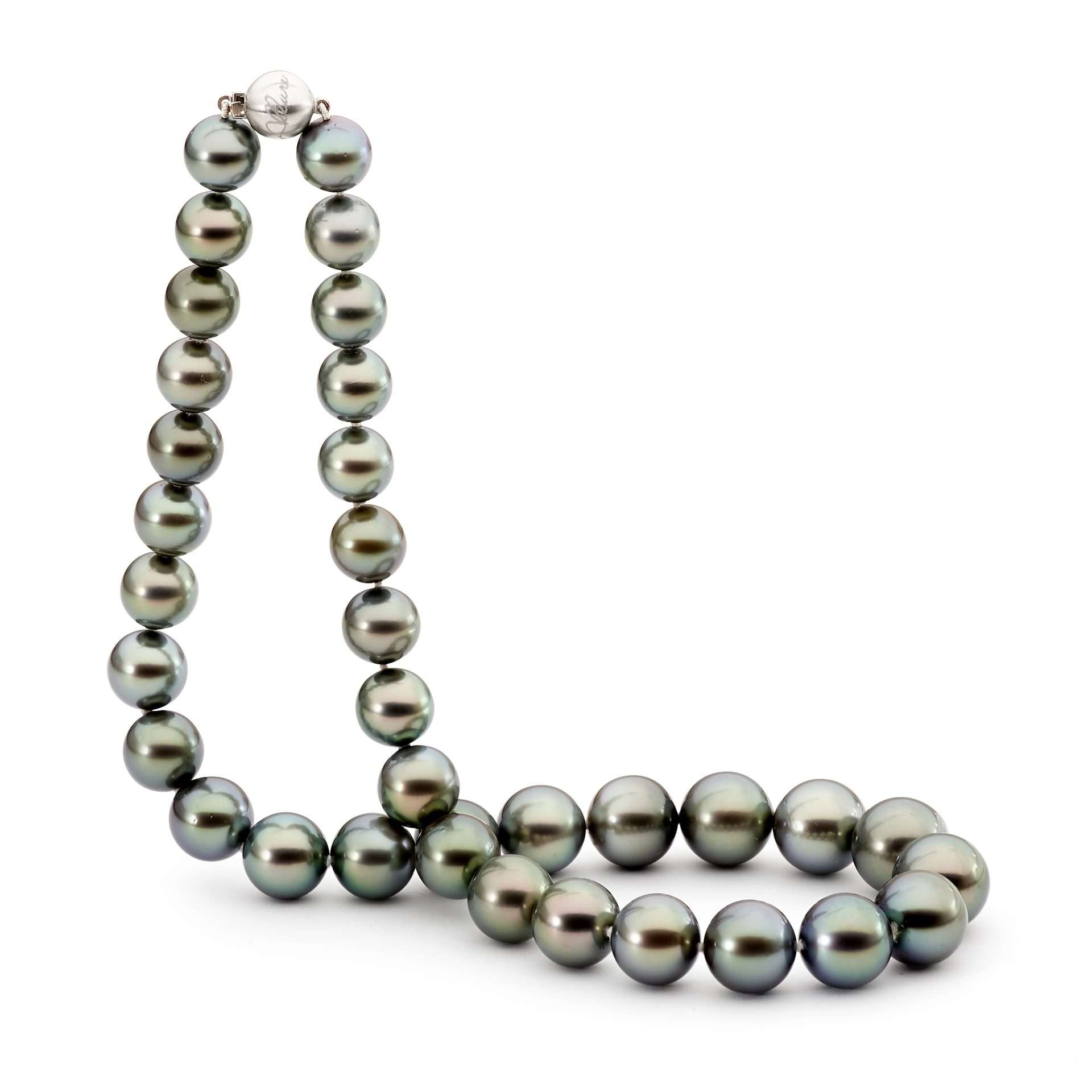This magnificent 35 piece pearl strand includes a combination of both round/near round 11-14mm Tahitian South Sea pearls, and is complete with an 18ct white gold ball clasp.