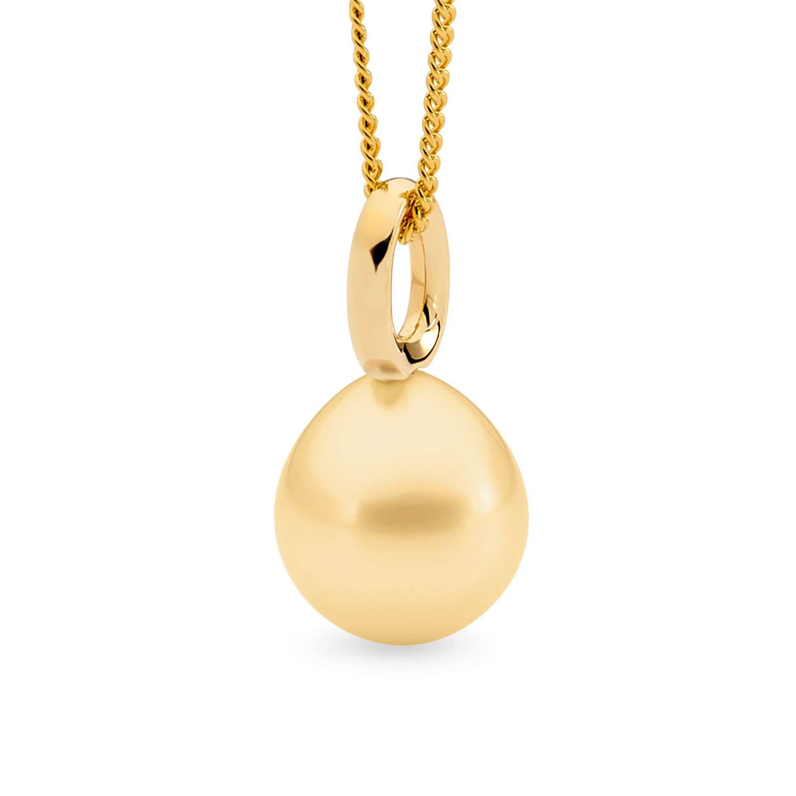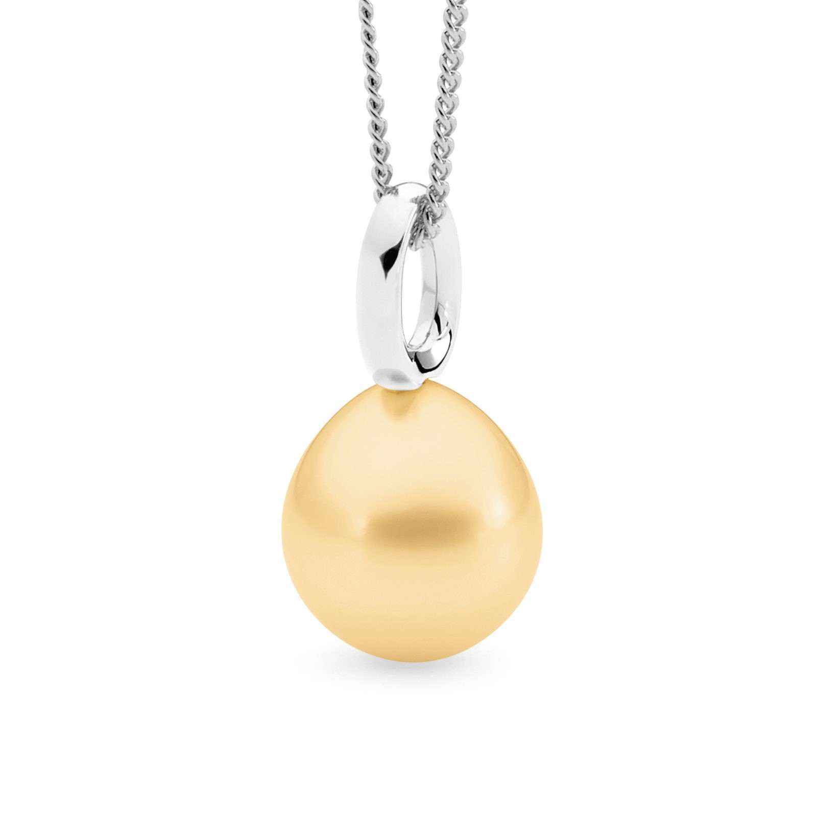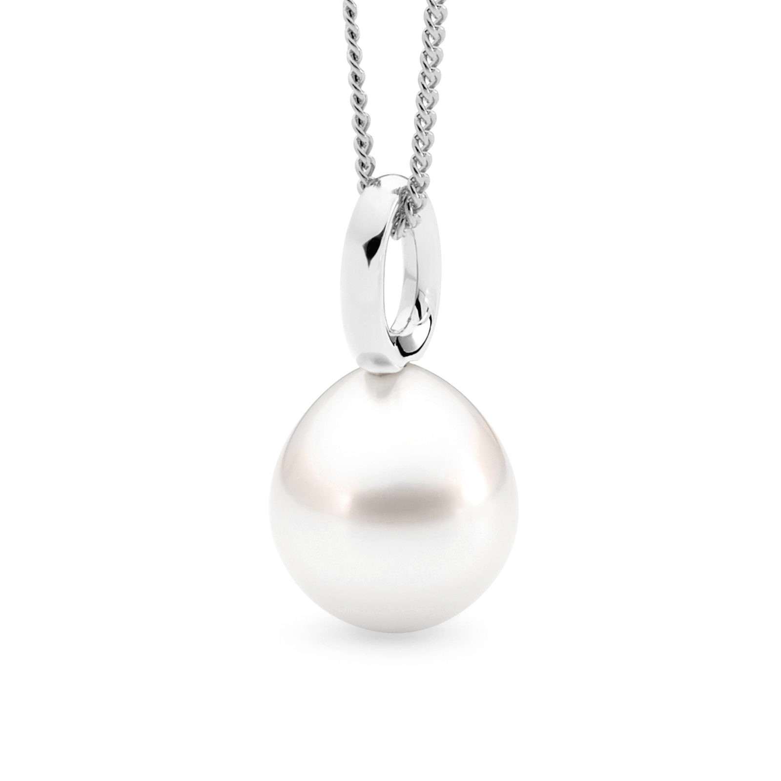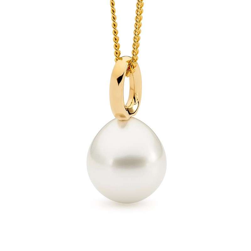 This classic single looped bale pendant is set in 18ct yellow or white gold and features a lustrous 11-12mm oval/drop South Sea pearl.