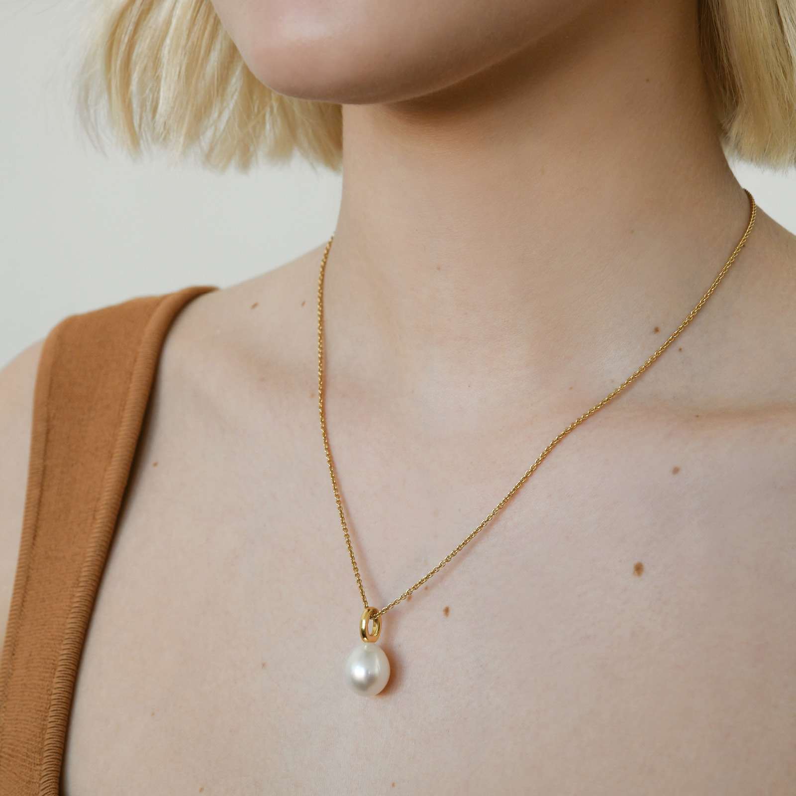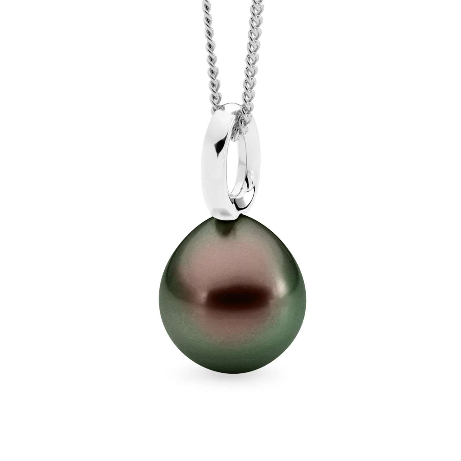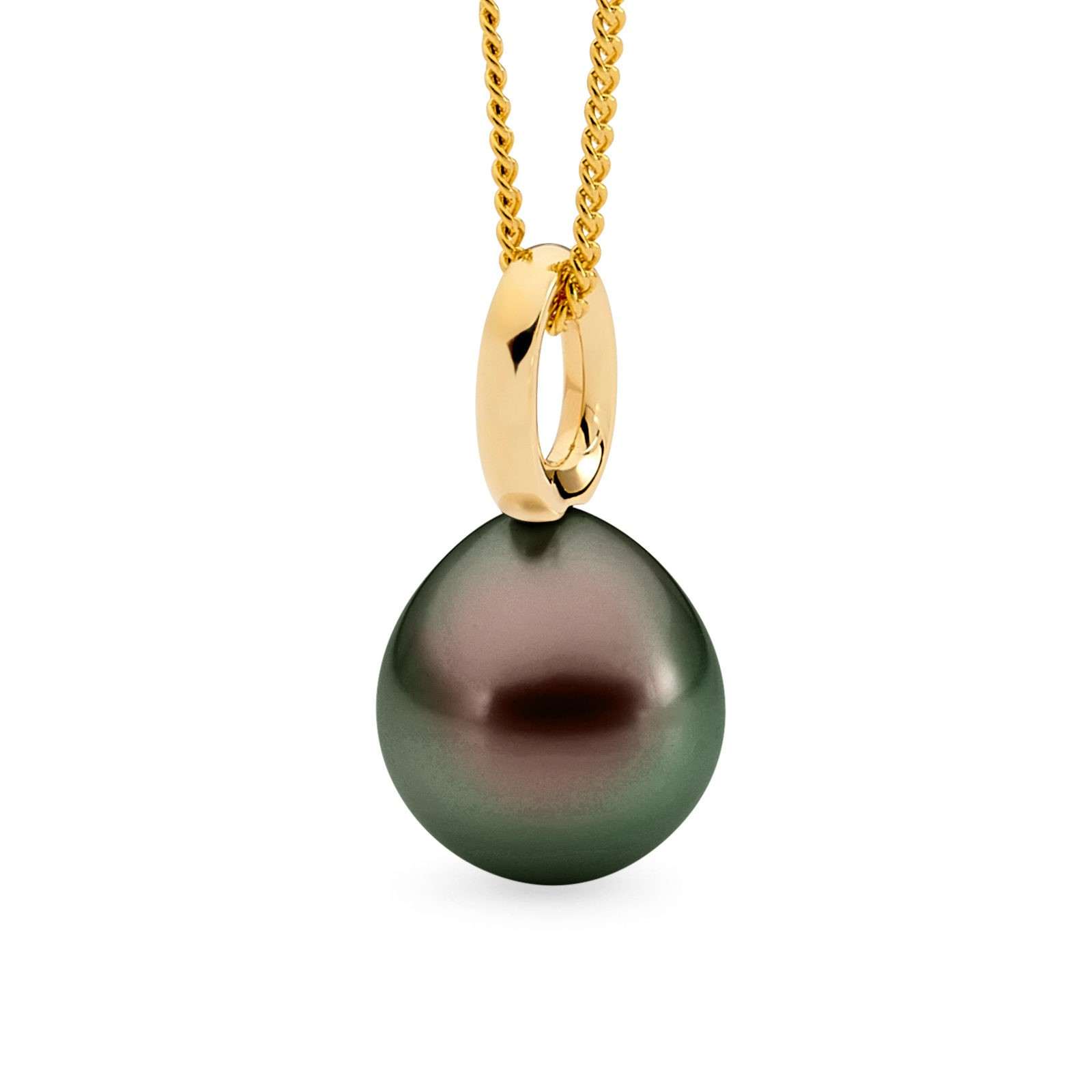 This classic single looped bale pendant is set in 18ct yellow or white gold and features a lustrous 11-12mm oval/drop South Sea pearl.