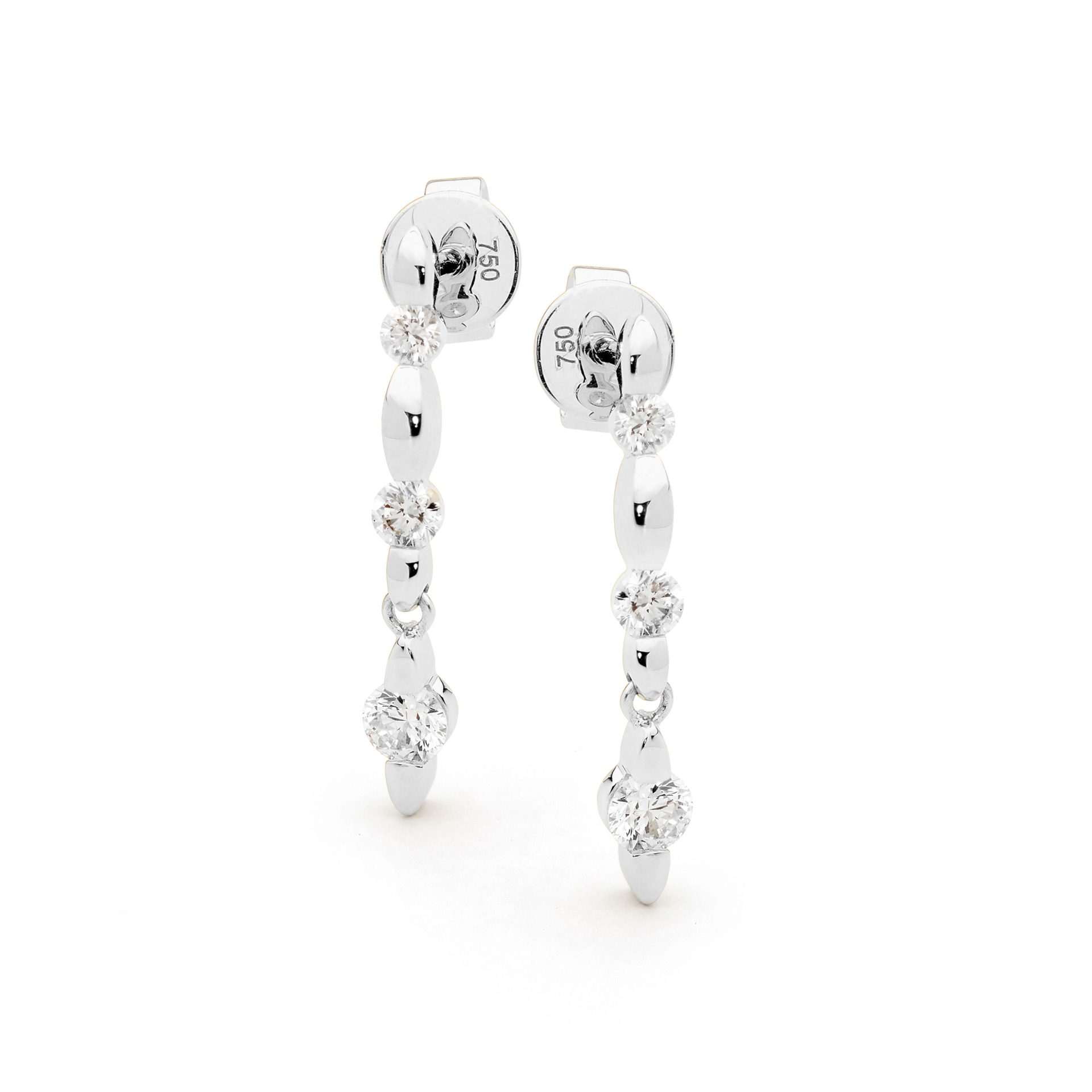 Set in 18ct white gold, these channel set diamond drop earrings feature 2x 0.05ct, 2x 0.08ct and 2x 0.15ct G/SI round brilliant cut diamonds.