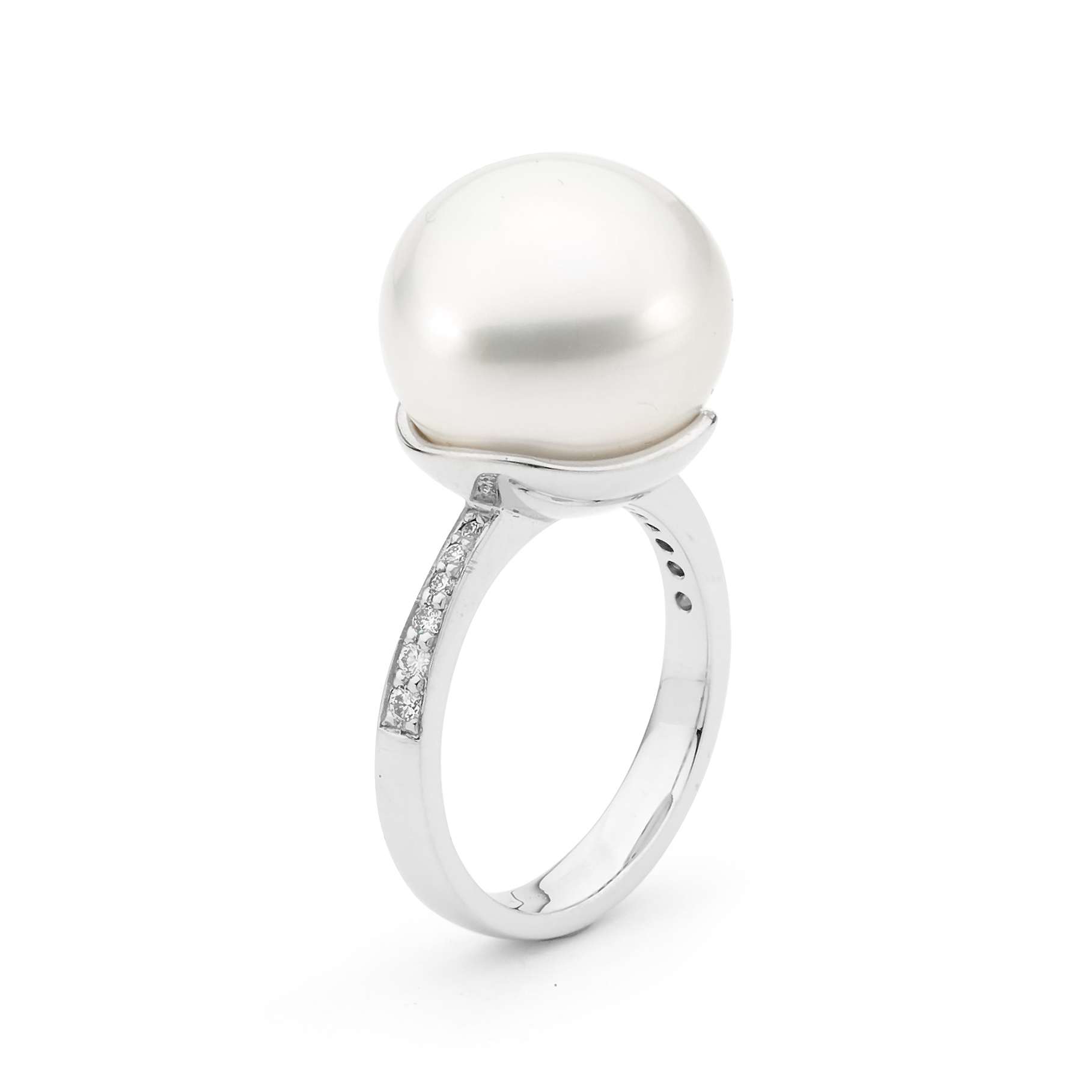 18ct white gold diamond baroque pearl ring featuring (12=0.16ct H/SI) diamonds and 14.8mm semi baroque white cultured South Sea pearl.
