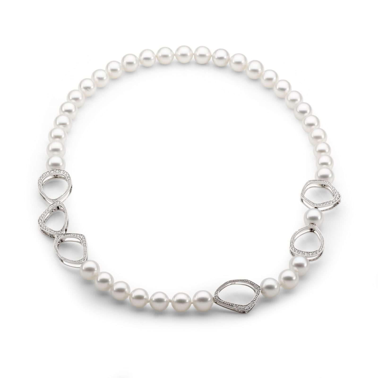 A classic design with a modern twist, the 37 piece (10-11mm) white Australian South Sea pearl strand features six striking 18ct white gold and diamond encrusted geometric shapes with a total diamond weight of 1.95ct that are peppered throughout the design, which beautifully represent the formation of winds building into a cyclone.