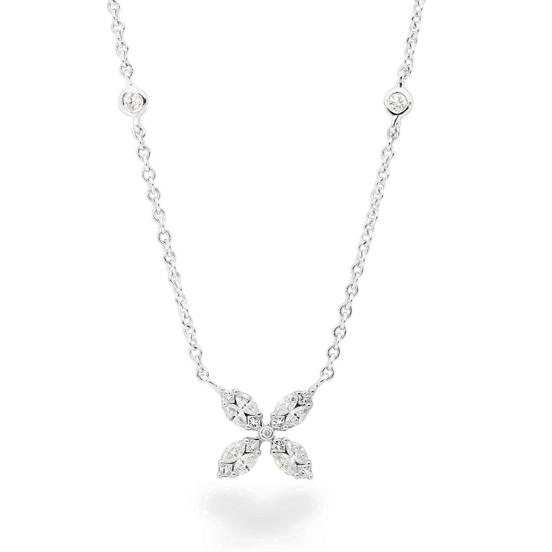Set in 18ct white gold, this necklet features 7=0.17ct G/VS round brilliant but diamonds, 8=0.23ct G/VS marquis diamonds, 8=0.09ct G/VS princess cut diamonds incorporating 45cm 18ct white gold fine trace chain.