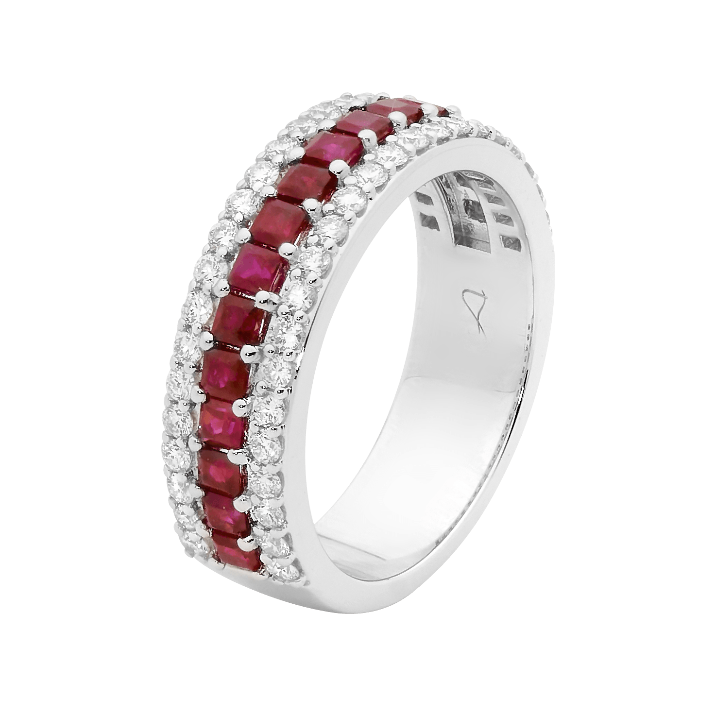 Set in 18ct white gold, this stunning ring features 17x 2x2mm princess cut rubies and 46= 0.69ct G/SI white diamonds.