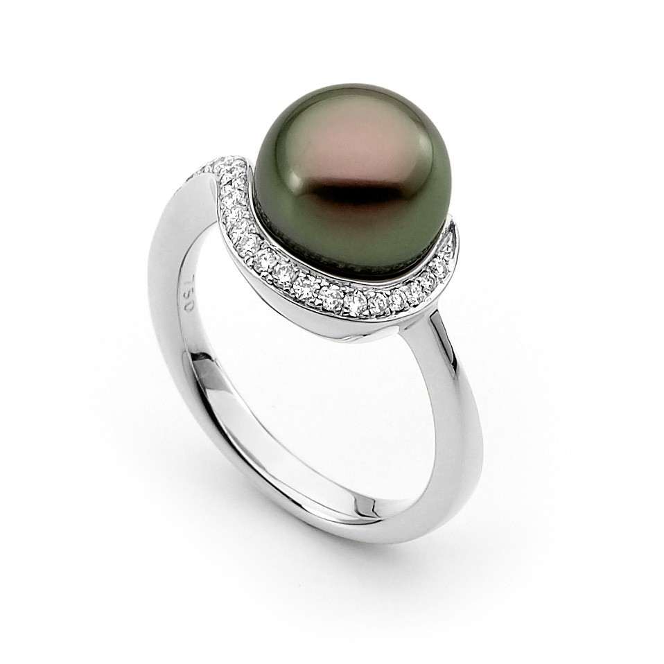 This striking ring is set in 18ct yellow or white gold, it features a lustrous 10-11mm button shaped South Sea cultured pearl and 21=0.16ct G/SI diamonds in a semi-halo setting.