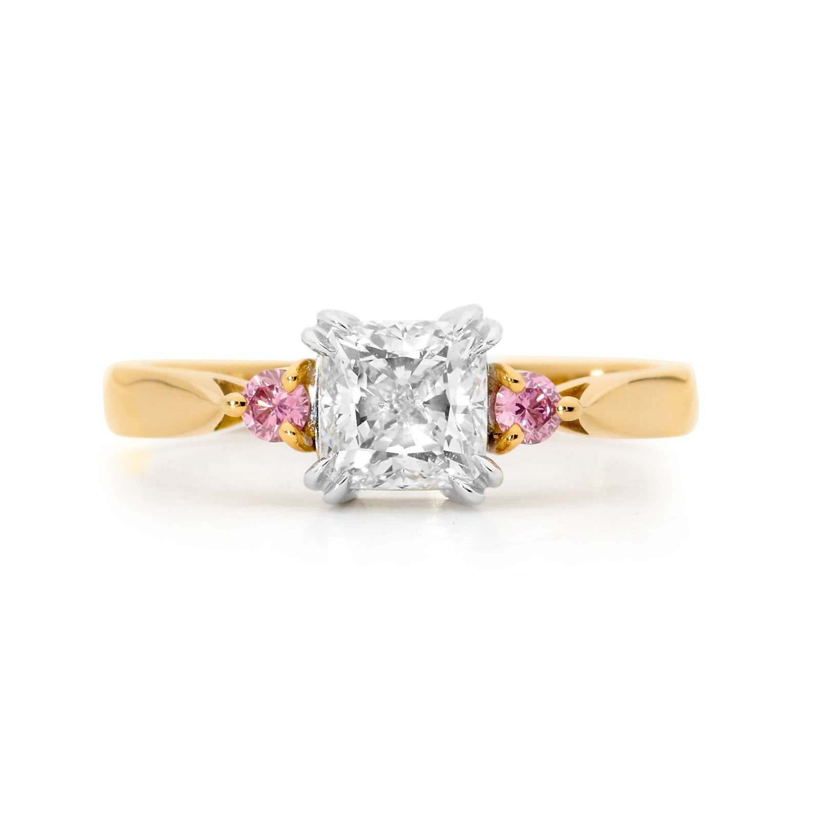 18ct yellow gold diamond ring featuring one 1.20ct F/VS1 cushion cut diamond and two brilliant cut 0.06ct 4P Argyle pink diamonds. POA MADE TO ORDER Our jewellery pieces are made from the finest gemstones and