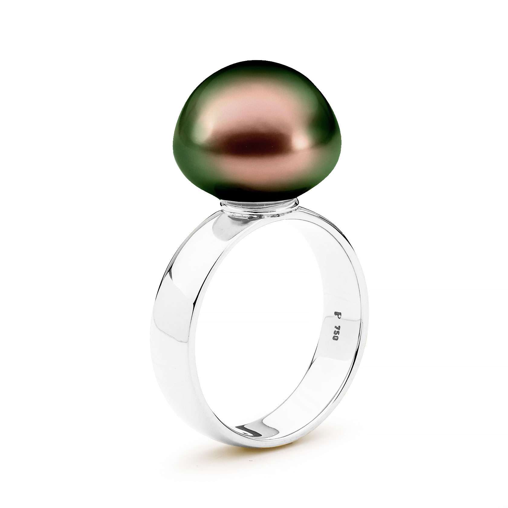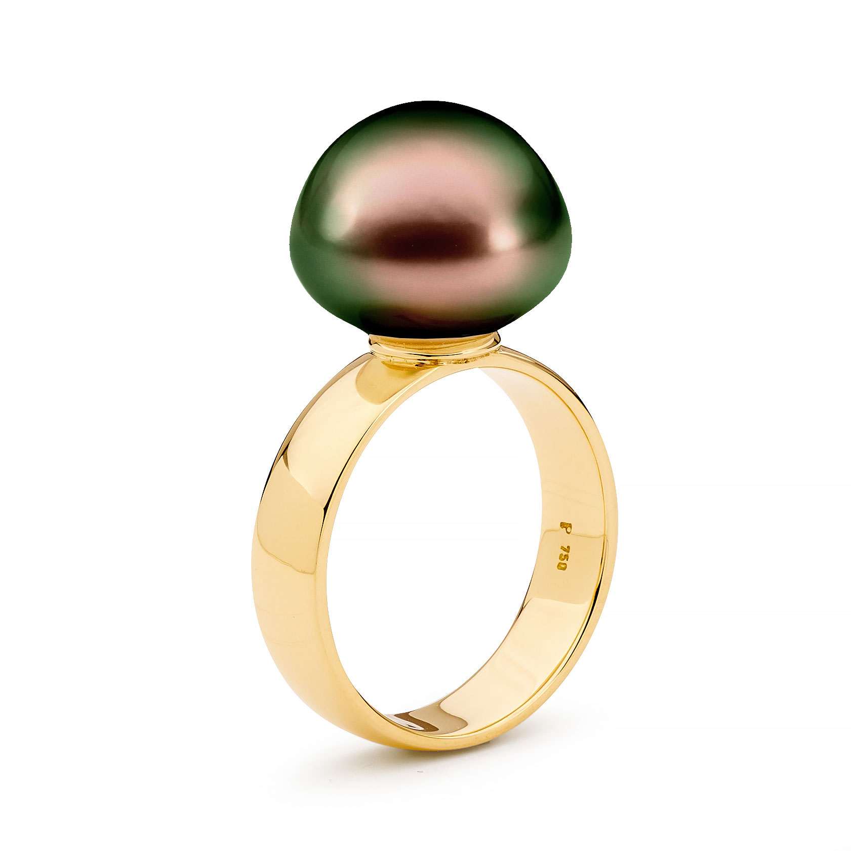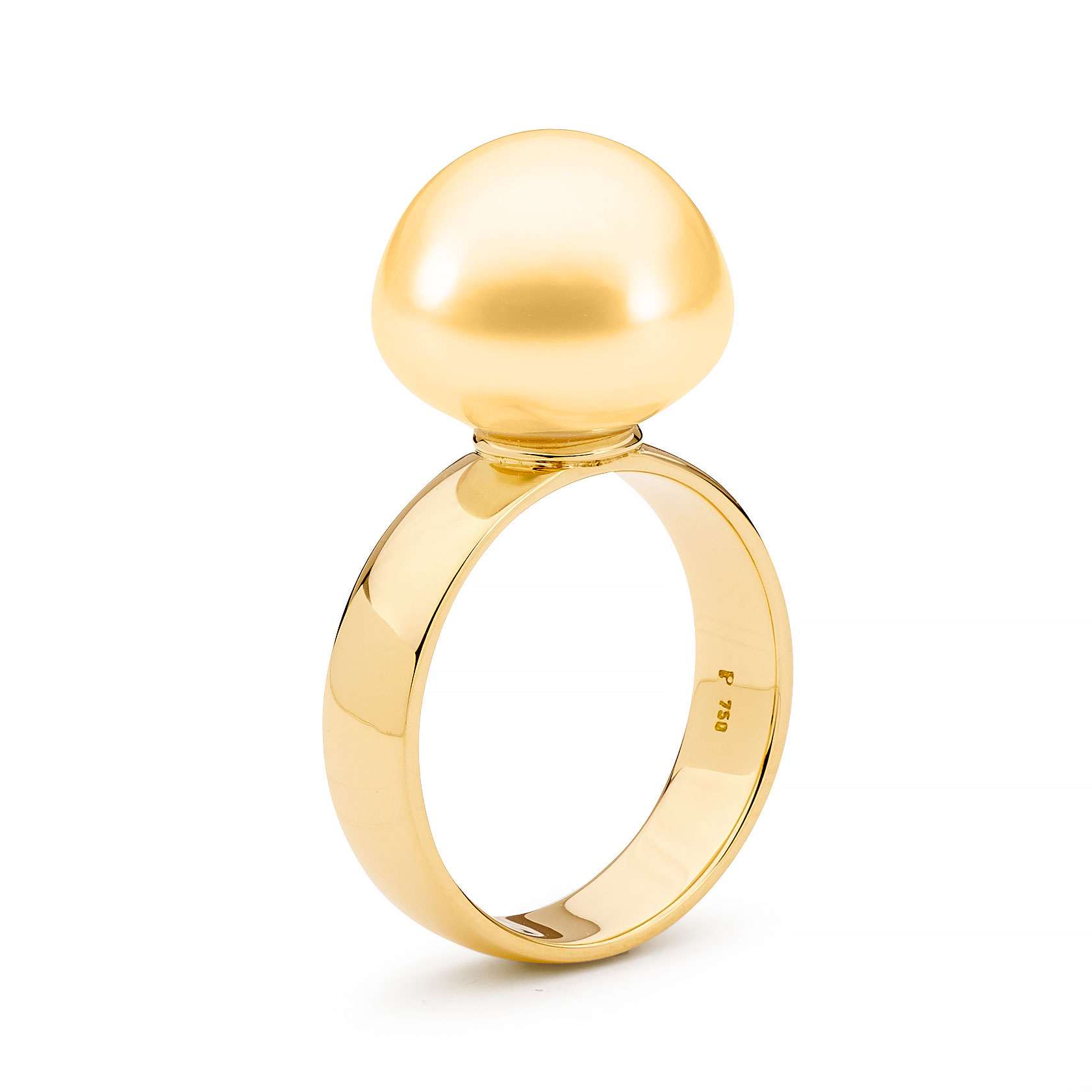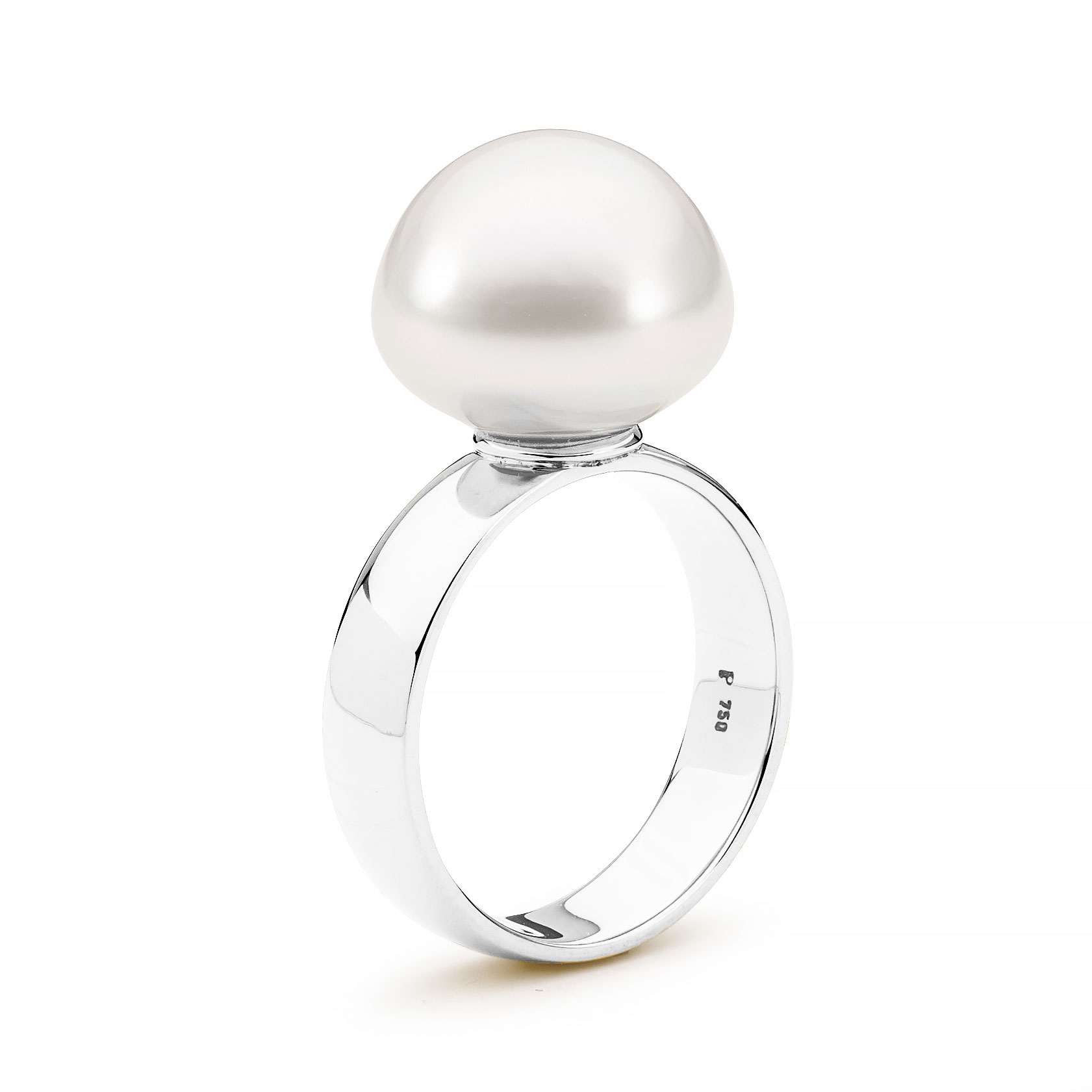 Crafted in 18ct yellow or white gold, this wide band ring features a lustrous 12-13mm South Sea cultured button pearl.