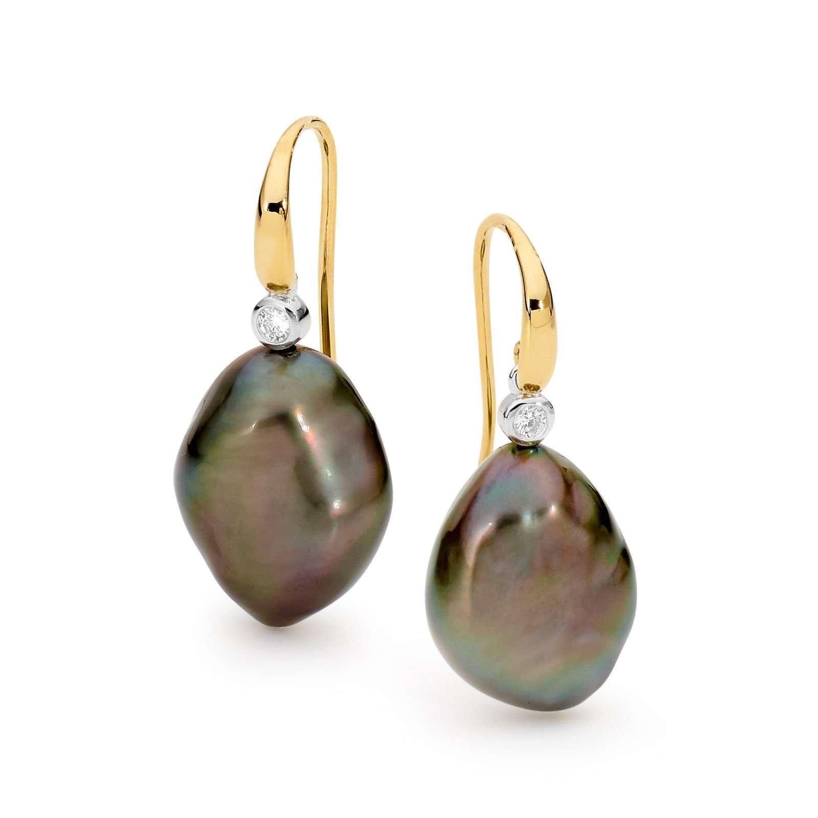 18ct yellow gold earrings featuring seedless baroque (13×15.5mm) South Sea pearls and two white round diamonds totalling 0.10ct.