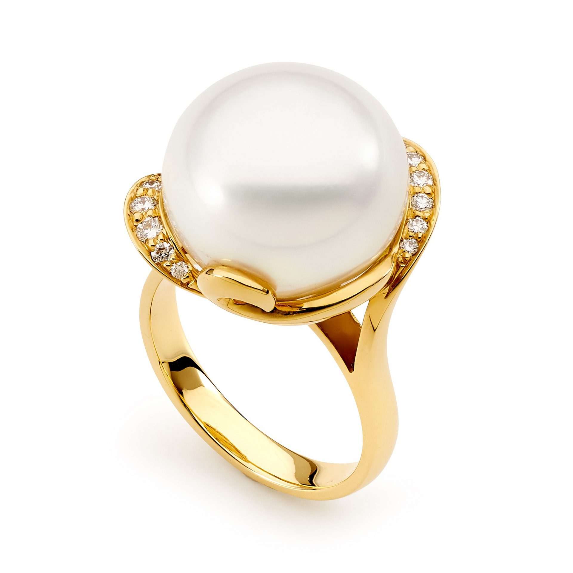 18ct yellow gold Fleur de Lis ring featuring one 15-16mm high button Australian South Sea cultured pearl and 14=0.17ct G/SI round brilliant cut diamonds. If the design allows, we offer complimentary sizing of our rings