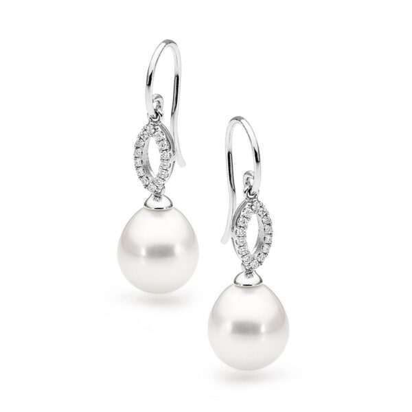 Like Seagrass swaying with the ocean’s rhythm, These earrings are handcrafted in 18ct yellow gold and feature a lustrous pair of 13-14mm oval Australian South Sea pearls and feature four white brilliant cut diamonds (4=0.19ct) G/SI.